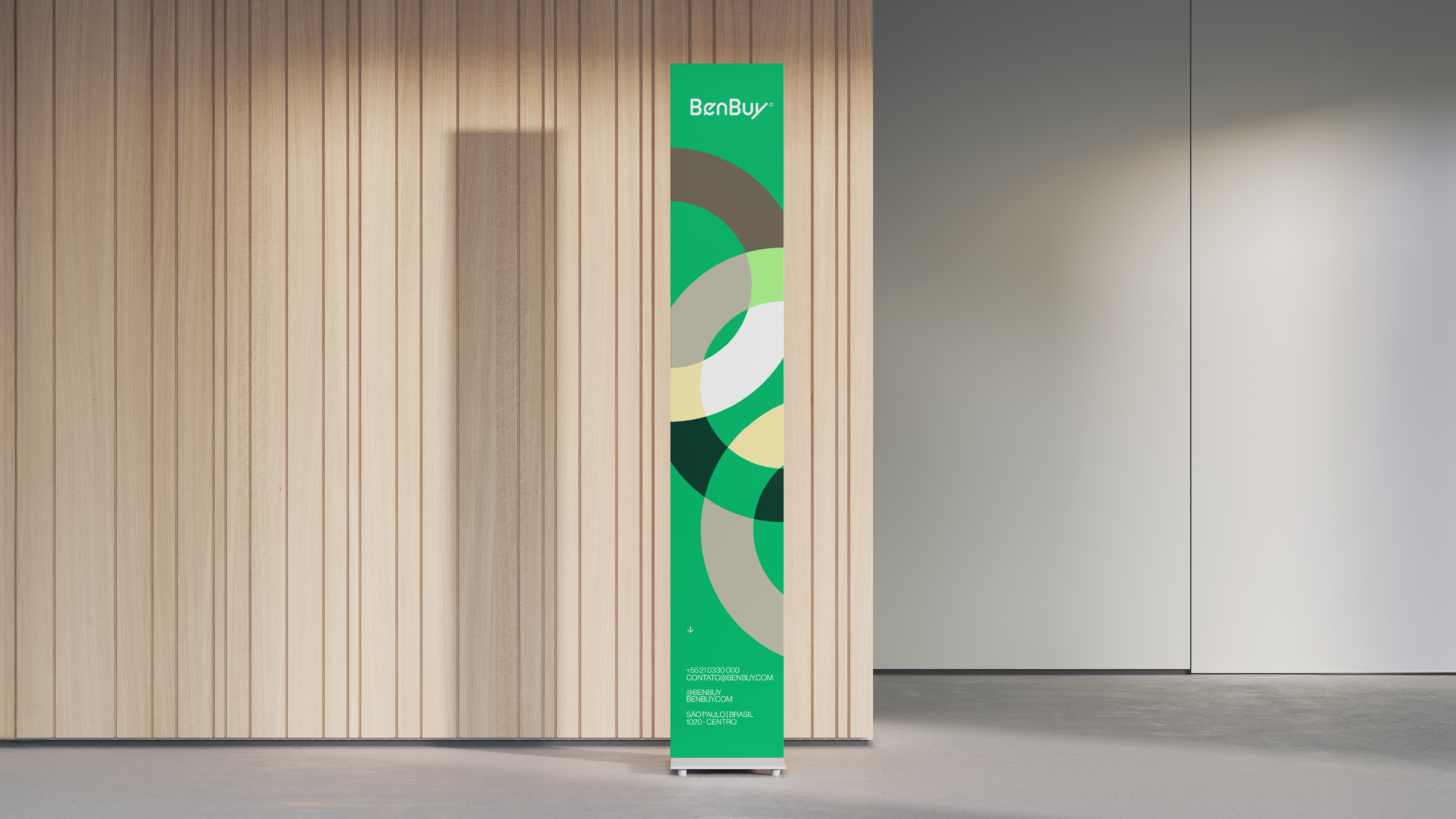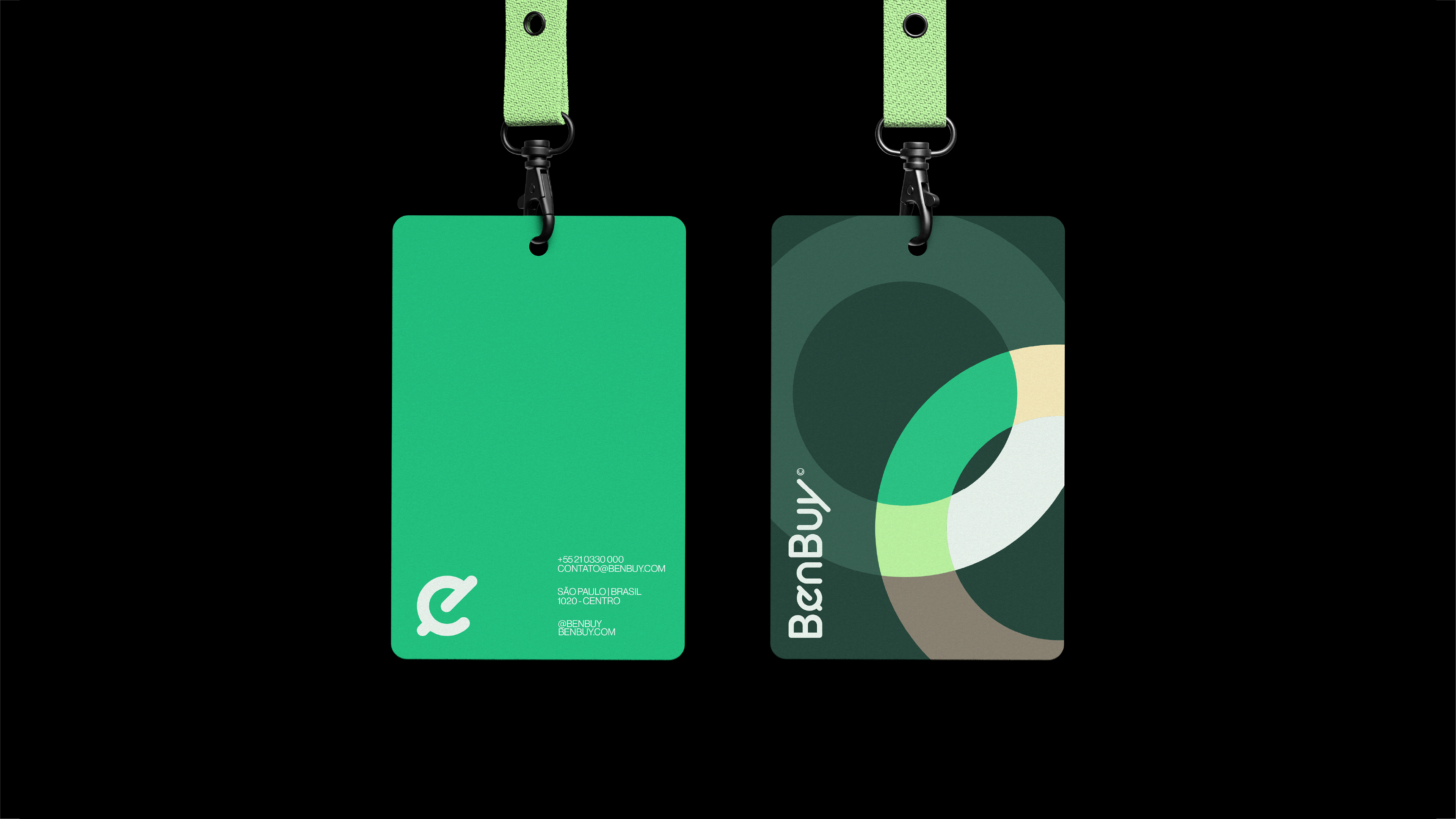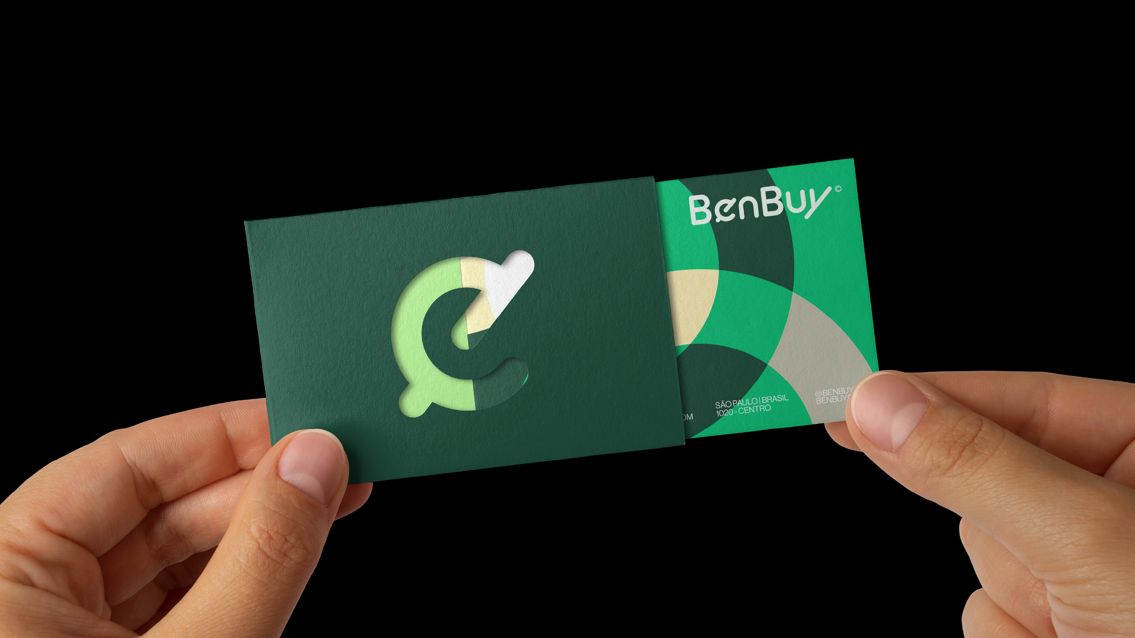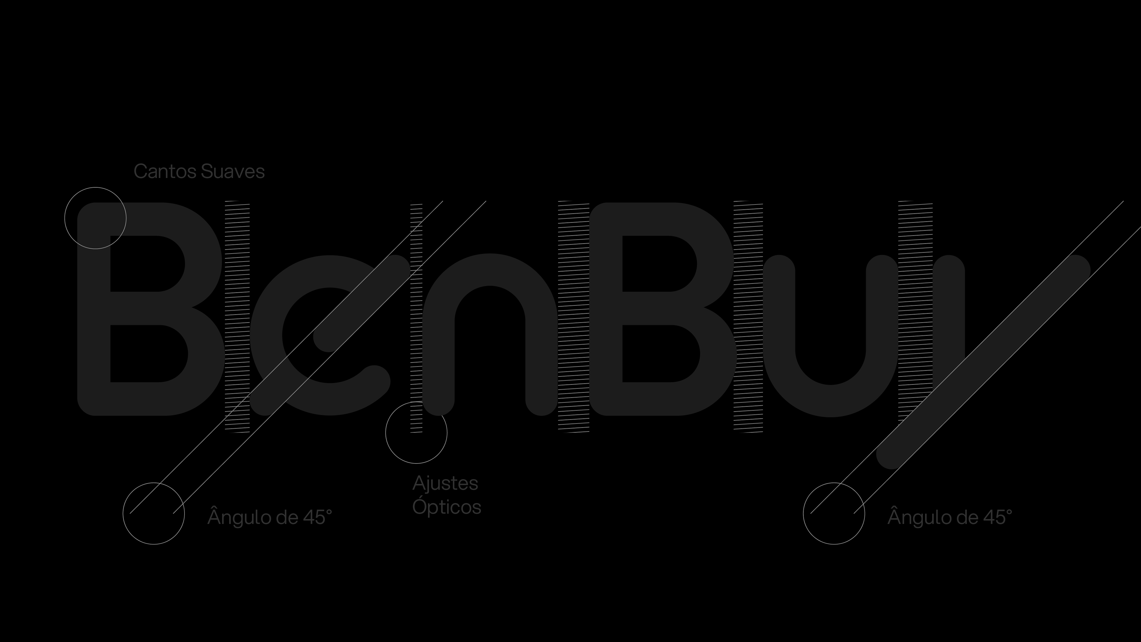 A identidade visual da BenBuy é ancorada por uma tipografia proprietária que equilibra fluidez e precisão, caracterizada por cantos suaves e cortes marcantes em ângulos de 45° que simbolizam atitude resolutiva e ação contínua. Complementando essa estética moderna, a paleta de cores tem como protagonista o vibrante "Verde BenBuy", que representa o otimismo e a energia ativa do "Smart Money". Essa cor principal marcante é equilibrada por uma base de tons neutros e minerais que trazem um toque humano e acolhedor, além de verdes profundos que projetam a solidez institucional e a confiança essenciais para o mercado corporativo B2B.