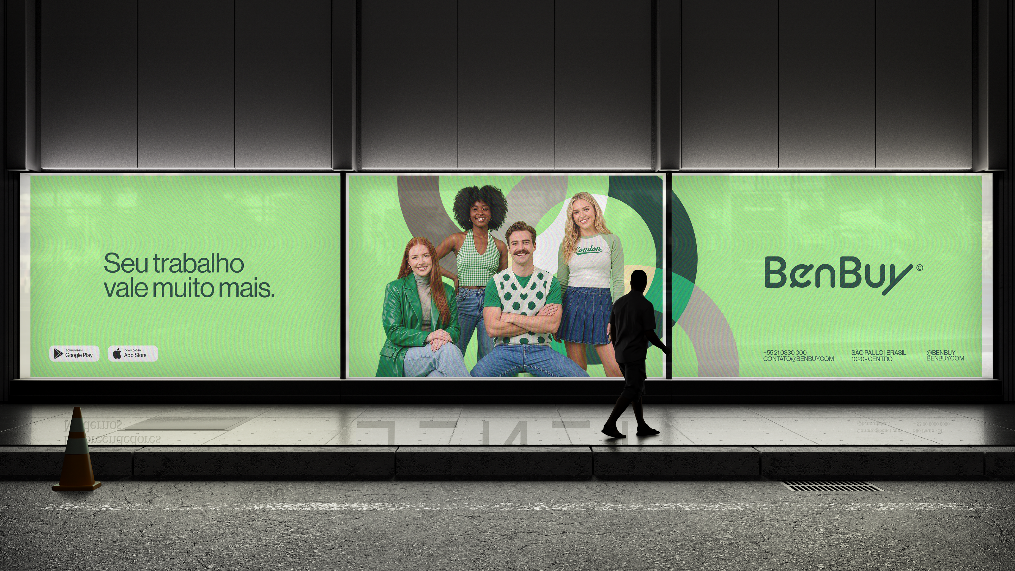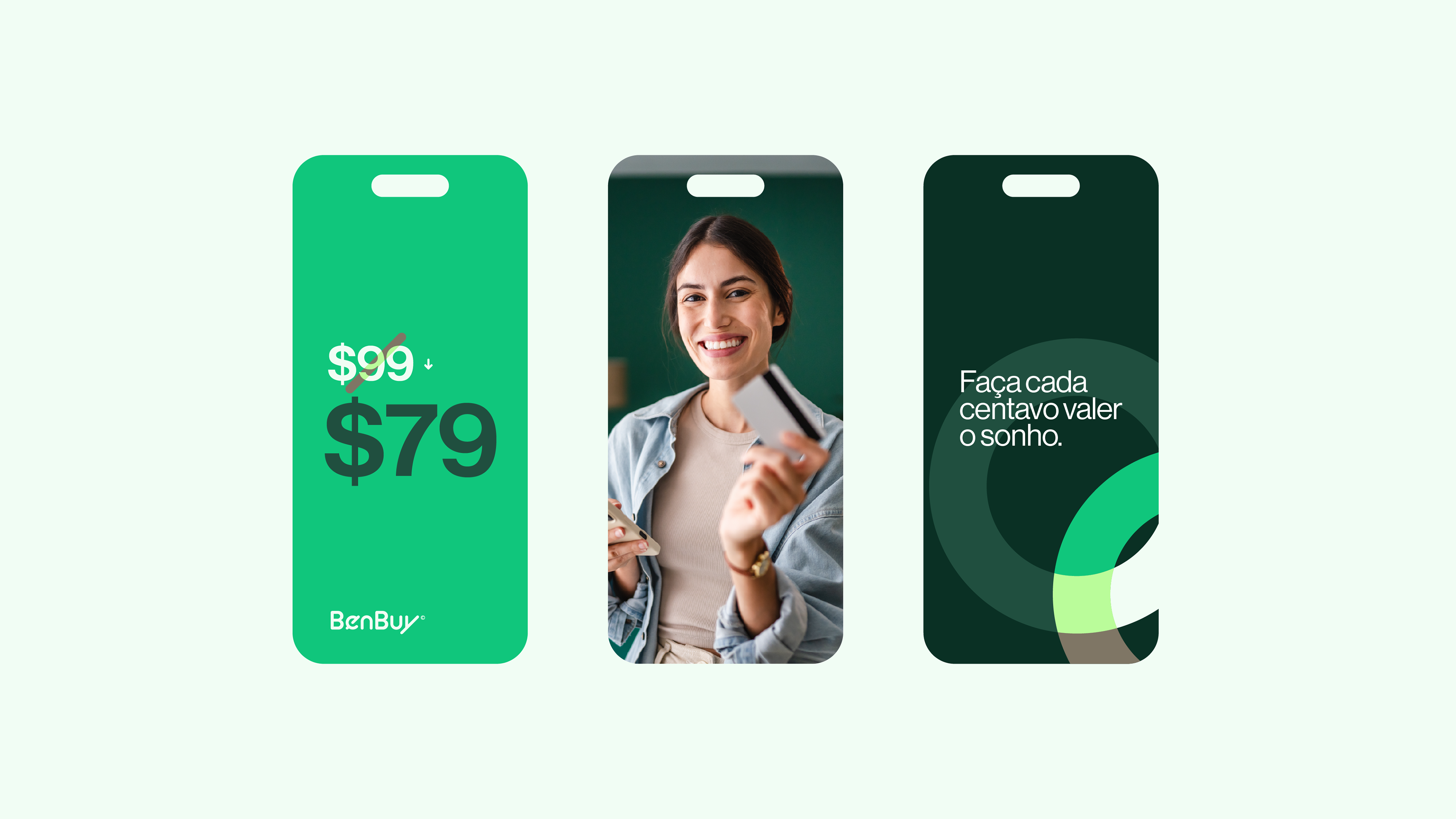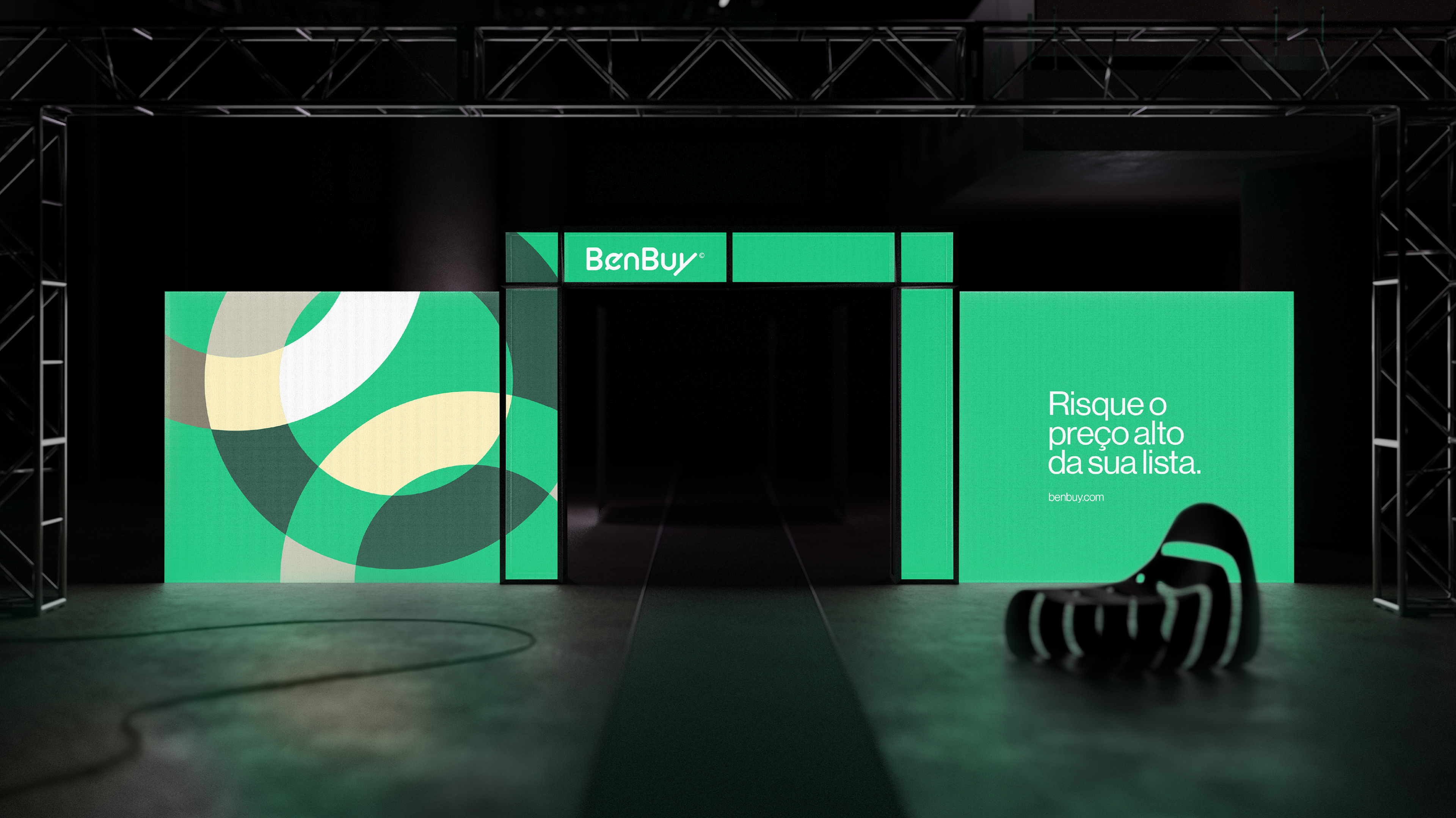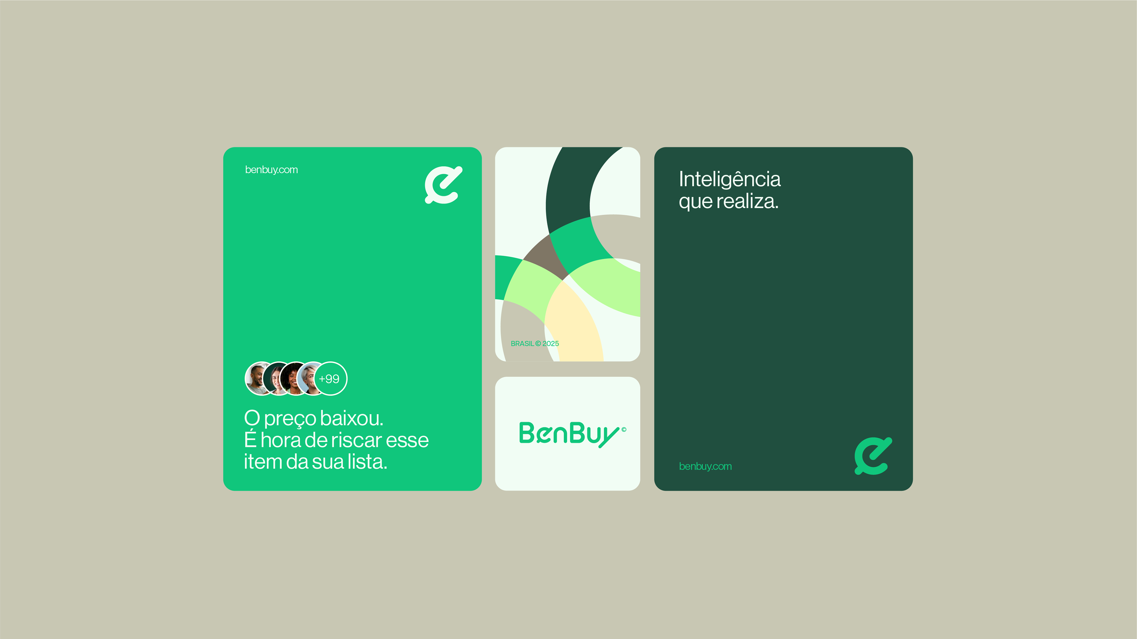 A identidade visual da BenBuy é ancorada por uma tipografia proprietária que equilibra fluidez e precisão, caracterizada por cantos suaves e cortes marcantes em ângulos de 45° que simbolizam atitude resolutiva e ação contínua. Complementando essa estética moderna, a paleta de cores tem como protagonista o vibrante "Verde BenBuy", que representa o otimismo e a energia ativa do "Smart Money". Essa cor principal marcante é equilibrada por uma base de tons neutros e minerais que trazem um toque humano e acolhedor, além de verdes profundos que projetam a solidez institucional e a confiança essenciais para o mercado corporativo B2B.