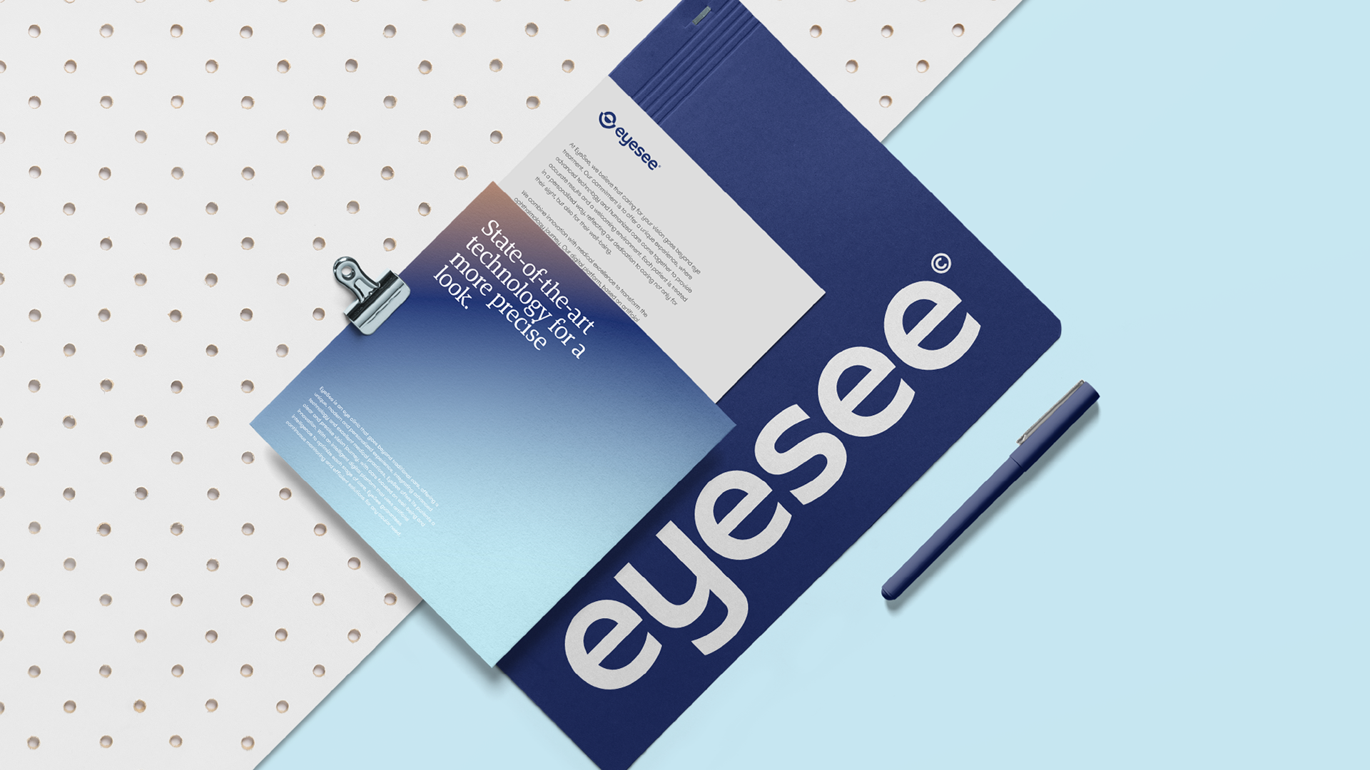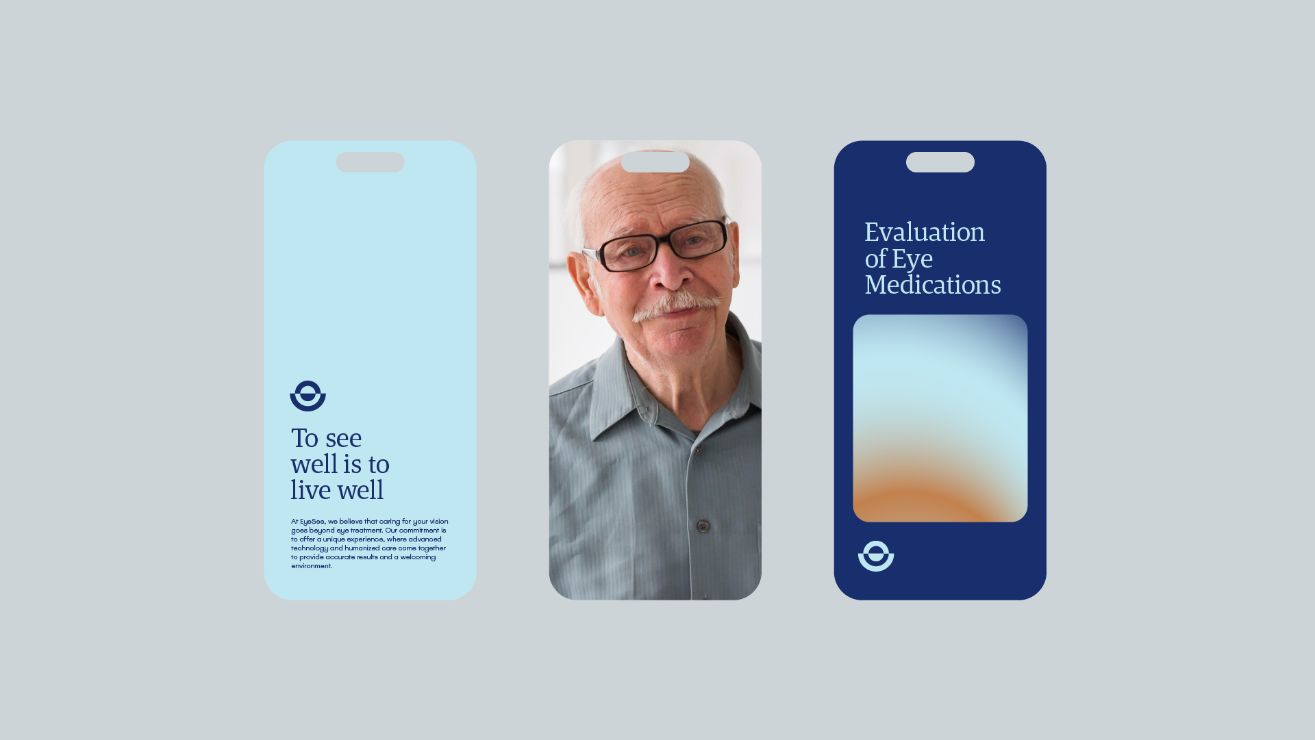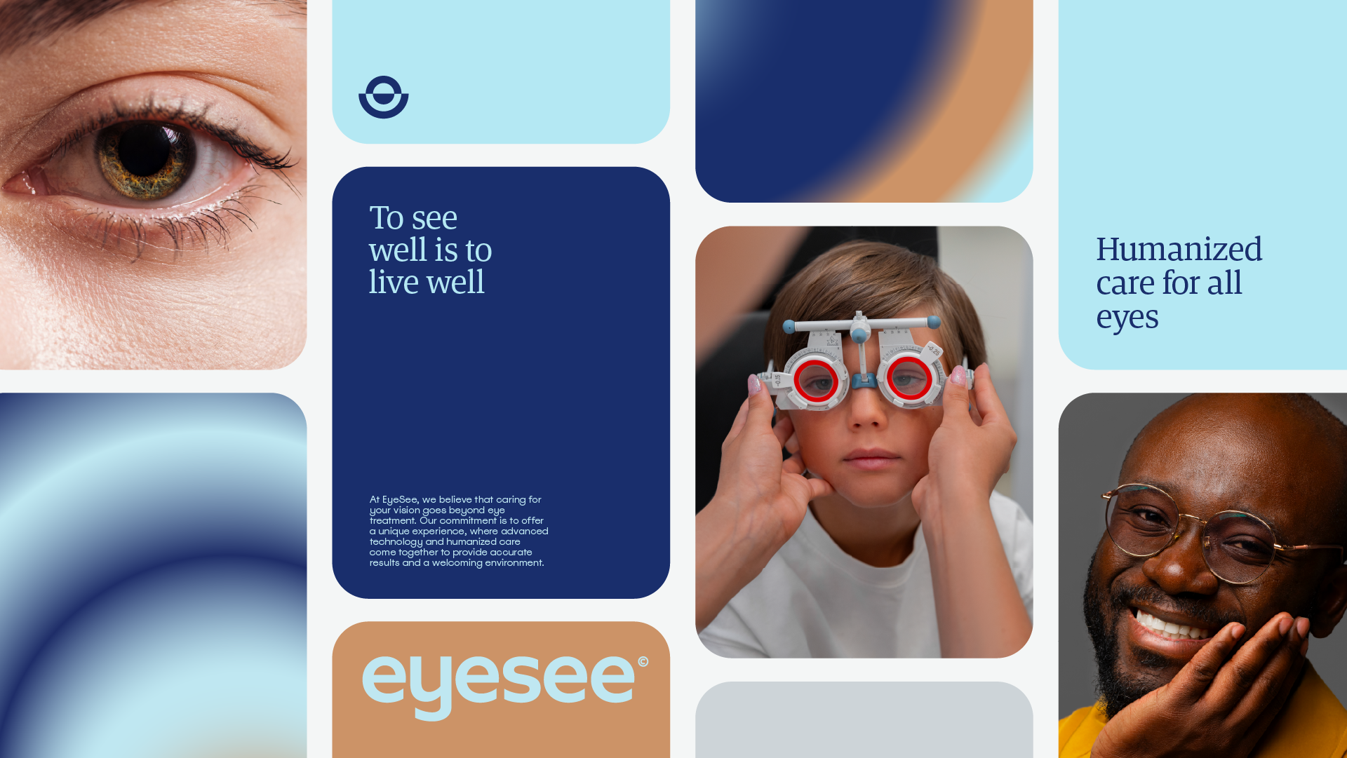 With a full color palette including Soft Cyan, Dark Blue, White, Brown and Medium Bluish Grey, EyeSee's visual identity has a sophisticated base, balancing modernity and reliability. The colors convey a sense of professionalism, welcome and innovation, with touches of warmth and softness in the shades of brown and grey, while the blue and cyan evoke confidence and clarity.