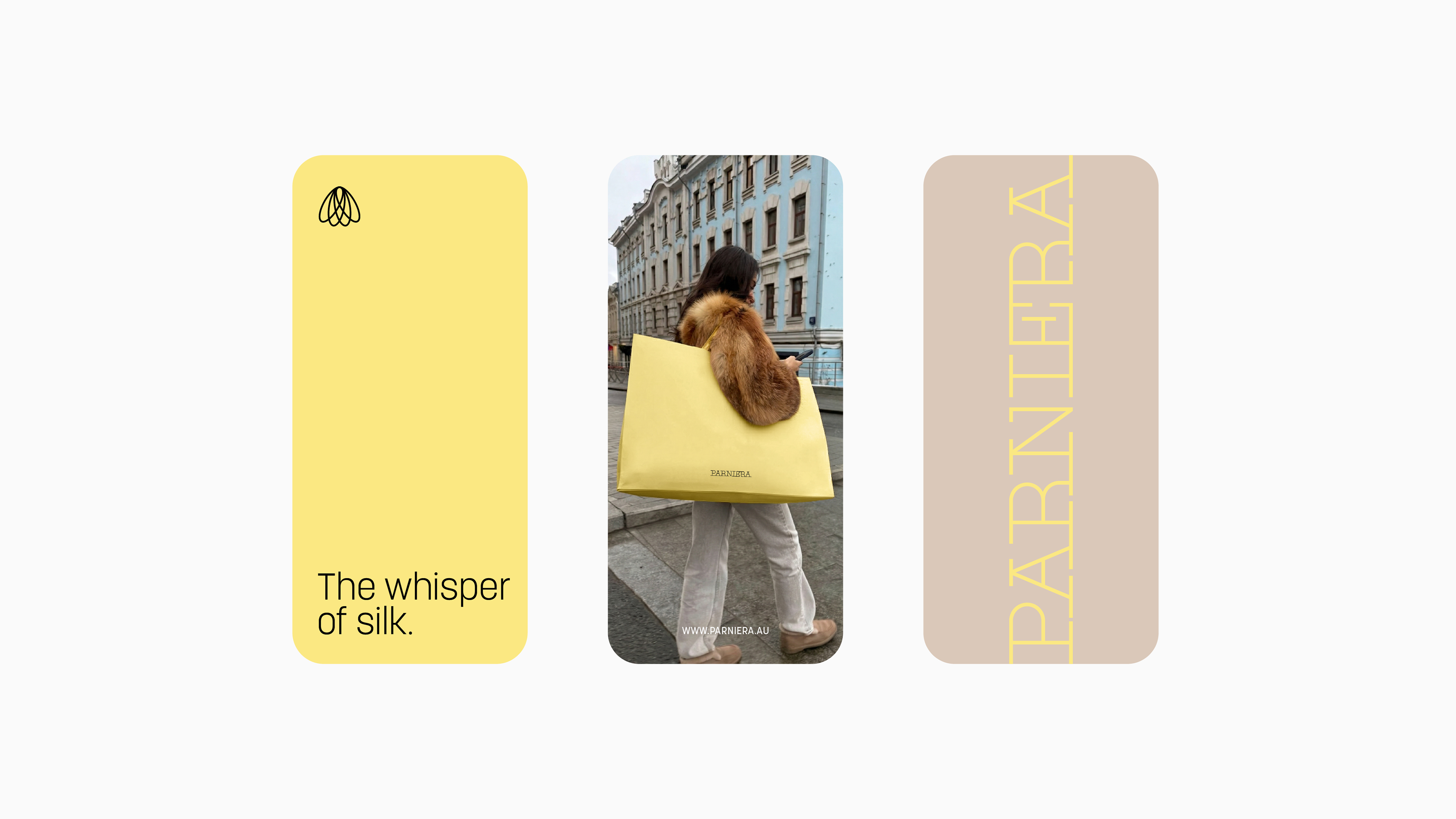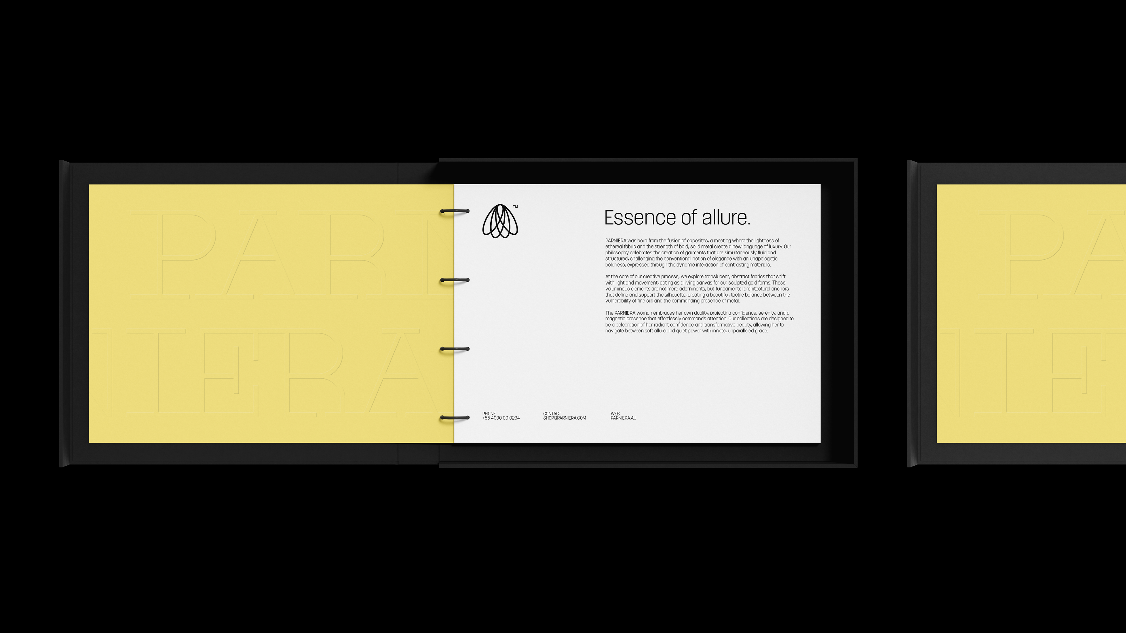 The silhouette of the moth represents the genesis of our craft. Just as the moth meticulously spins a single, continuous thread to build its cocoon, PARNIERA weaves architectural structure into every garment. It stands as a symbol of the uncompromising, meticulous tailoring that forms the solid "invisible canvas" upon which a woman's natural allure is built and celebrated.