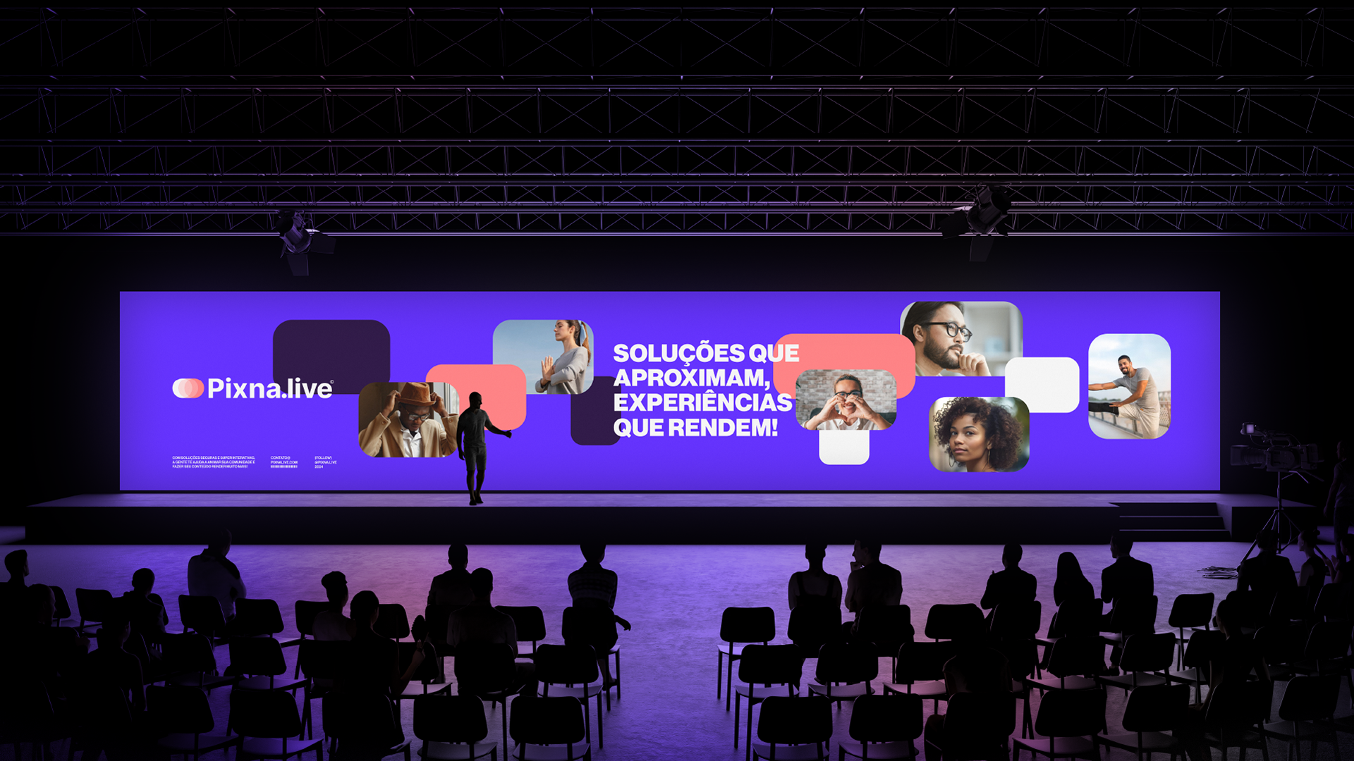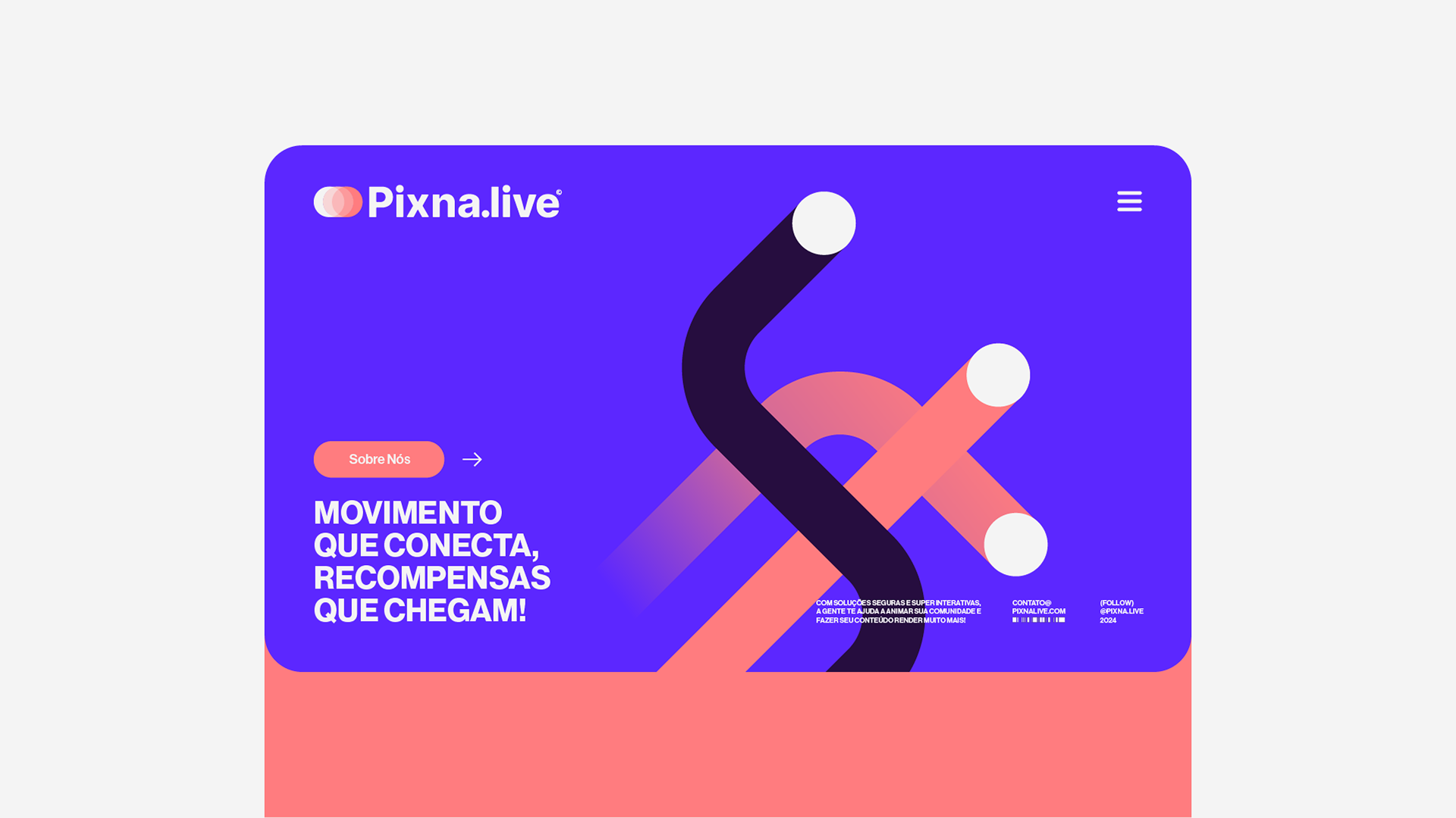 The first part, “MOVEMENT THAT CONNECTS”, conveys the idea of action and dynamism, suggesting that Pixna.live keeps interactions constantly evolving and provides a platform that brings people together in a meaningful way. “REWARDS THAT COME!” reinforces the promise of concrete results, indicating that all the effort of creation and interaction brings tangible benefits, such as increased visibility, community growth and, of course, the monetization of the creator's work.