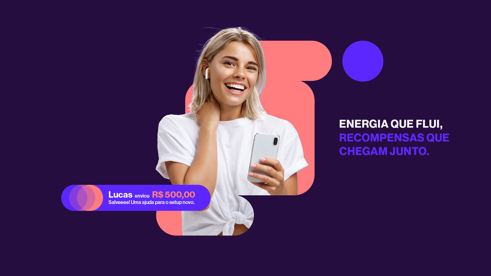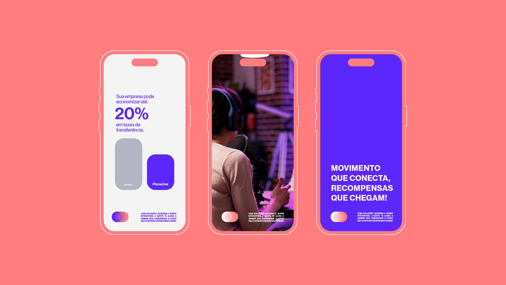 A primeira parte, "MOVIMENTO QUE CONECTA", transmite a ideia de ação e dinamismo, sugerindo que a Pixna.live mantém as interações em constante evolução e proporciona uma plataforma que une pessoas de maneira significativa. Já "RECOMPENSAS QUE CHEGAM!" reforça a promessa de resultados concretos, indicando que todo o esforço de criação e interação traz benefícios tangíveis, como aumento de visibilidade, crescimento da comunidade e, claro, a monetização do trabalho do criador.
