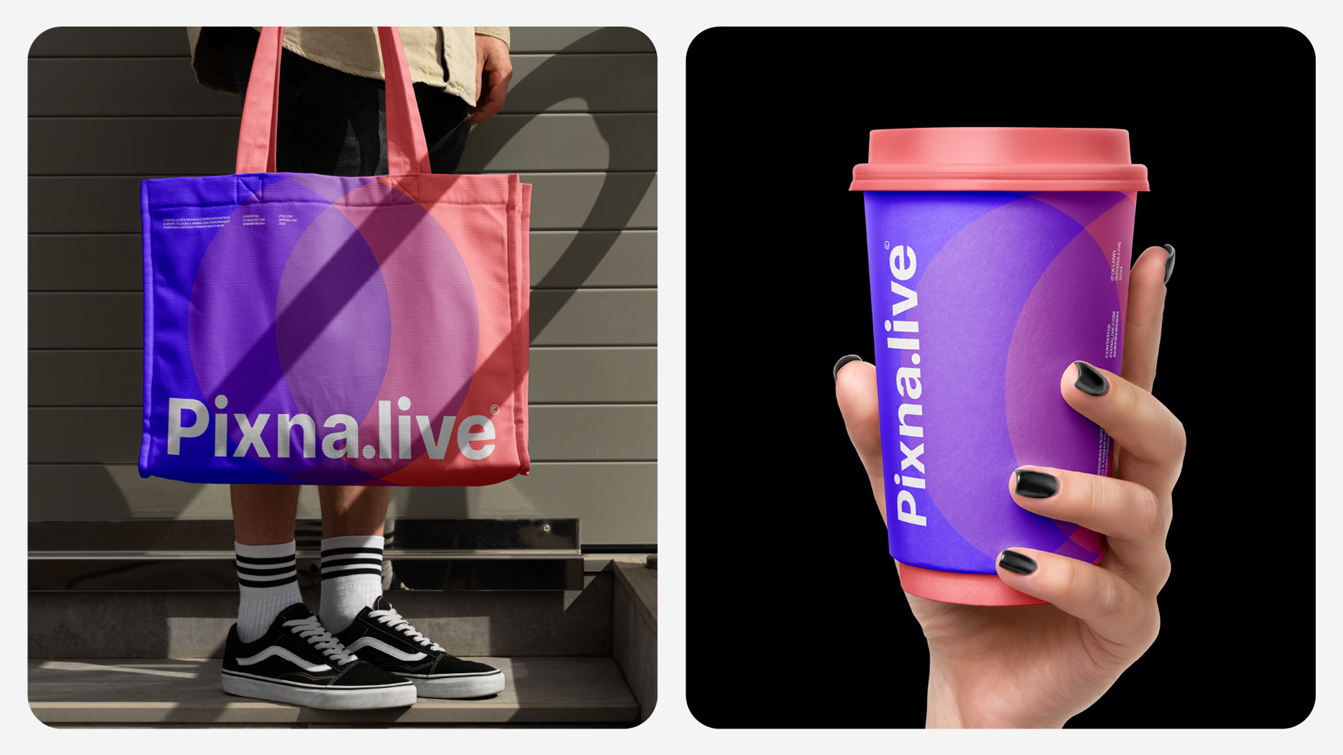 The movement implicit in the coin's design connects with the dynamism of the vibrant color palette, especially the gradient that runs from purple to reddish pink, suggesting transitions and progress. It also aligns with the abstract graphics, which symbolize energy and flow, creating a visual narrative that conveys innovation and modernity. By uniting concept and form, the symbol translates Pixna.live's purpose in a simple and impactful way, functioning as a central element that reinforces the brand's young, creative and connected personality.